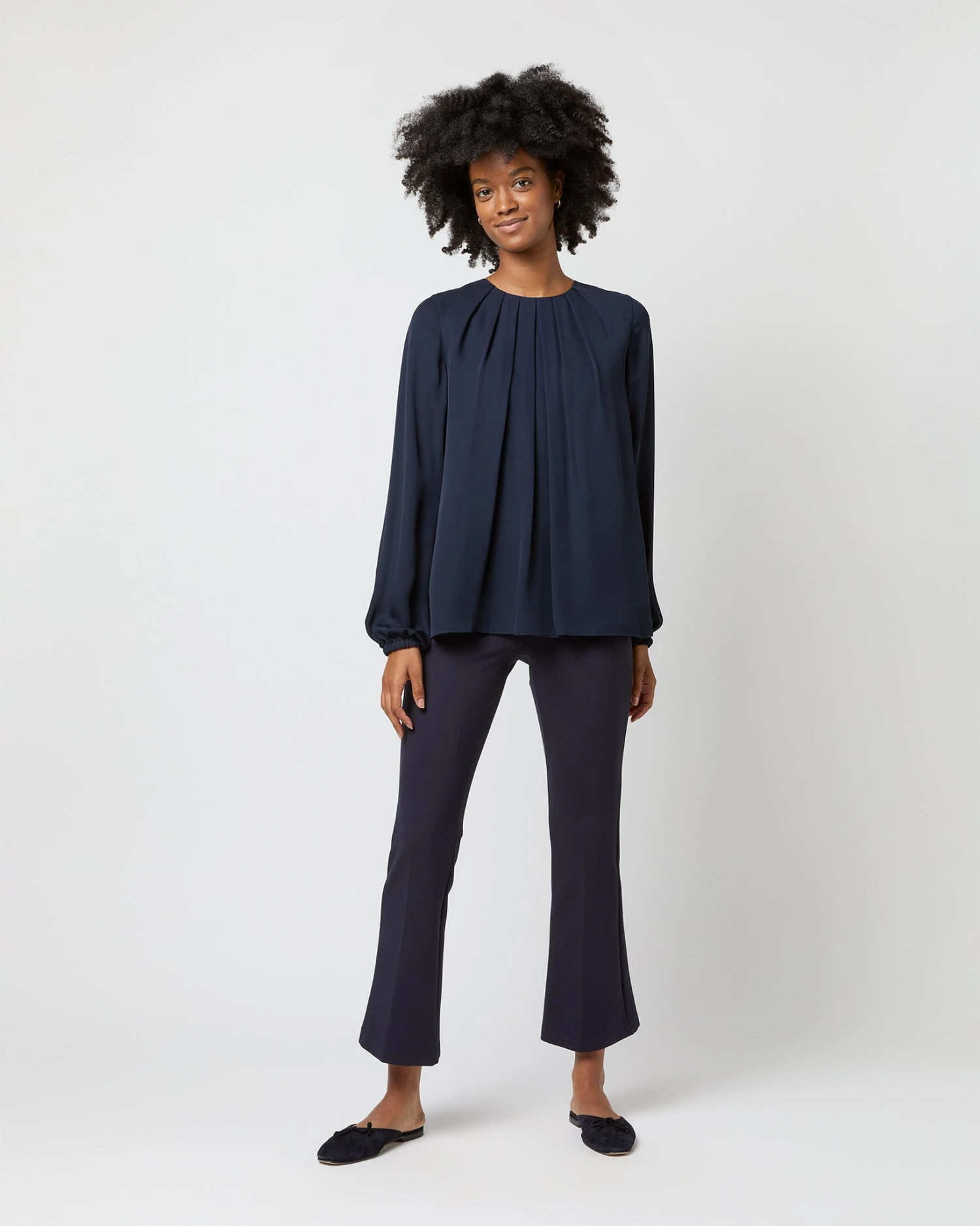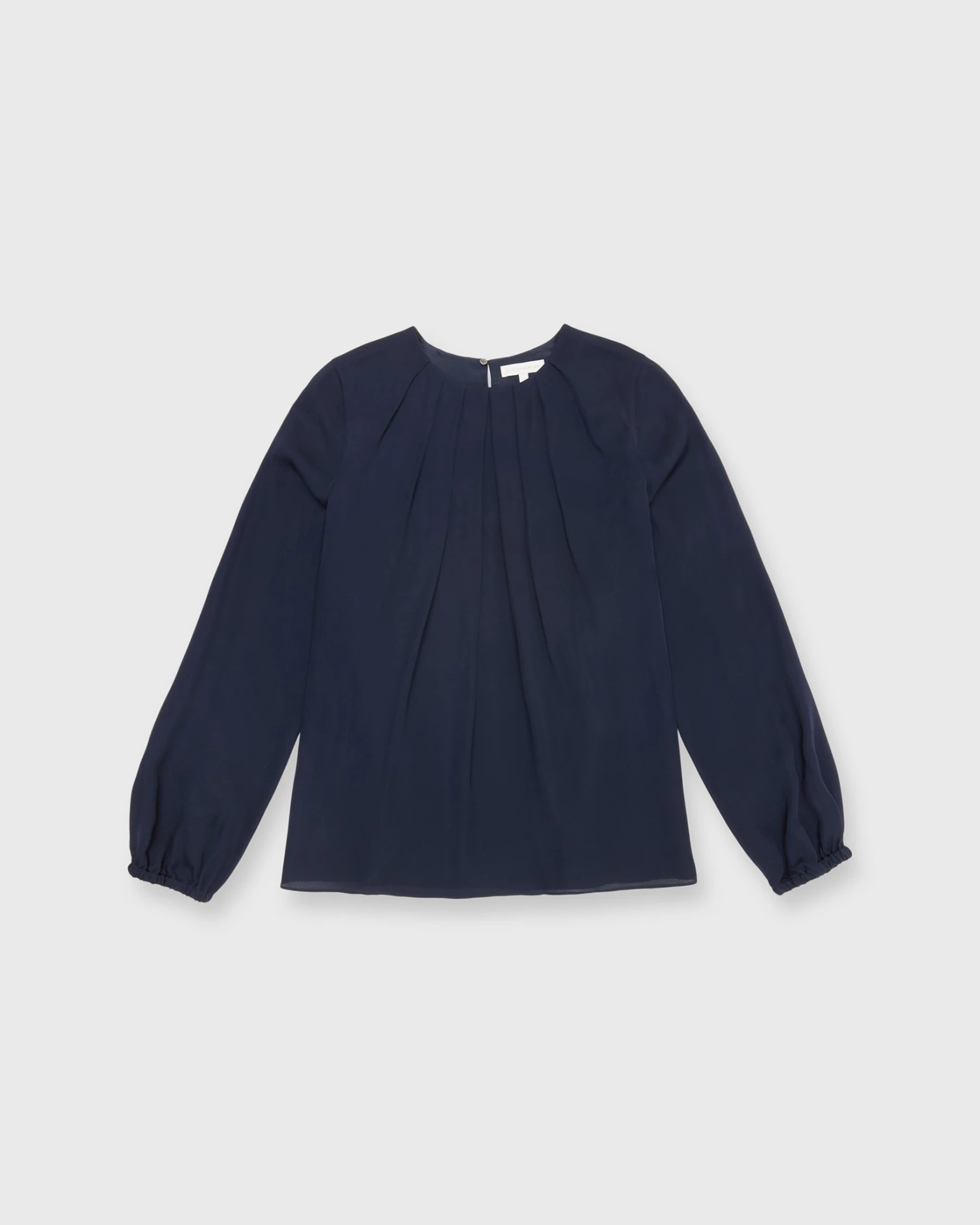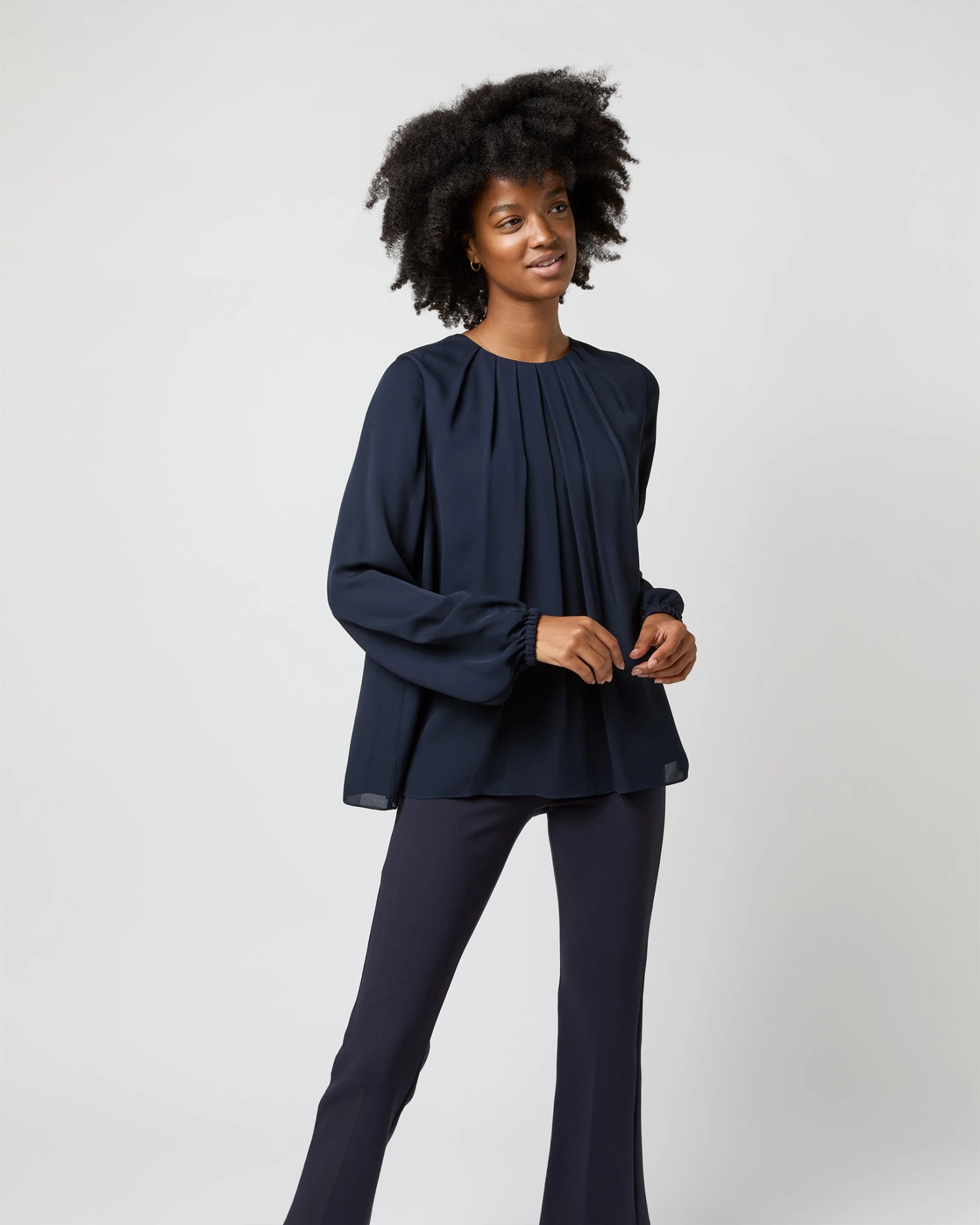 The Alex Top is a softer, more feminine take on a classic silk blouse, with romantic pleats at the neckline and subtle blouson sleeves with elasticated cuffs. It’s made of a delicate double georgette that’s lighter-weight than most of our other blouses… a perfect evening piece for all climates.