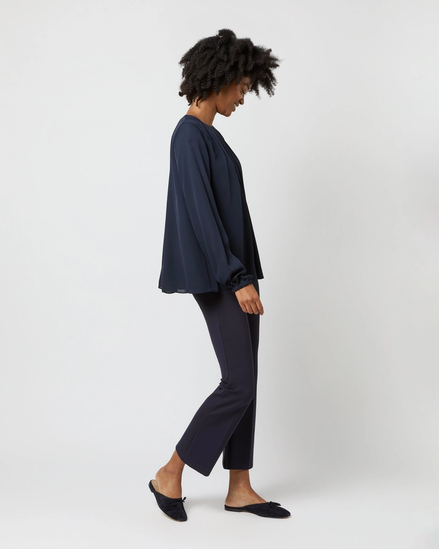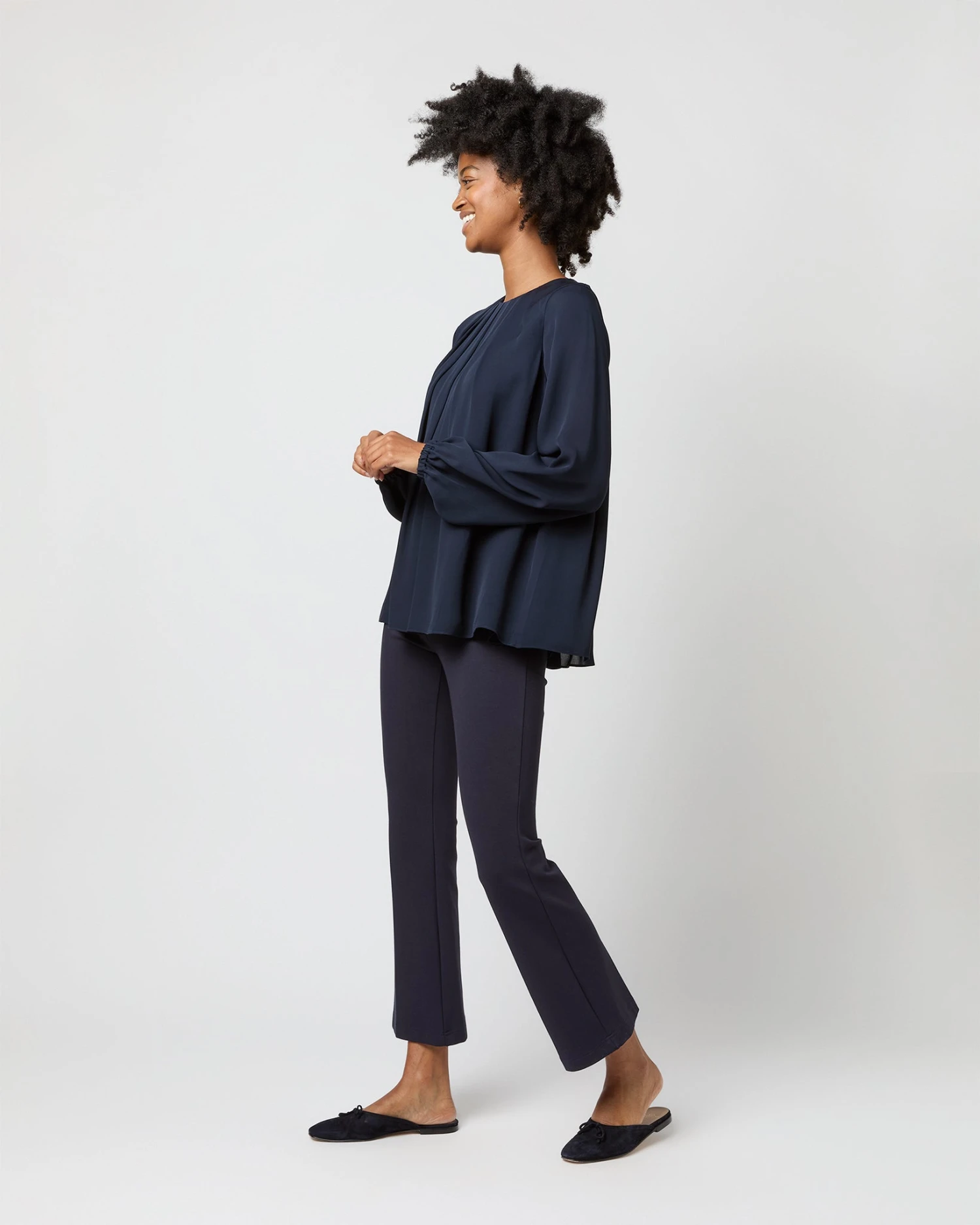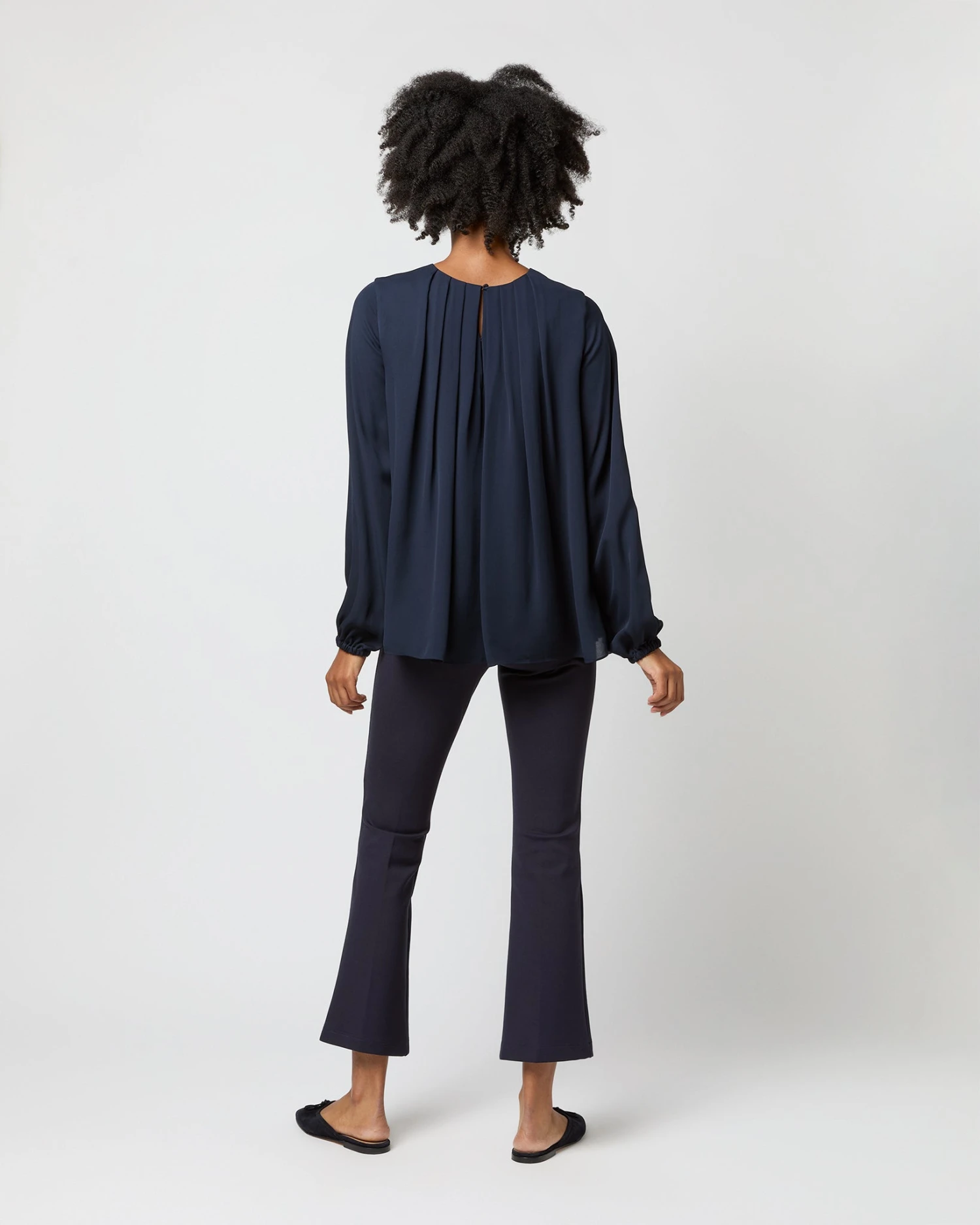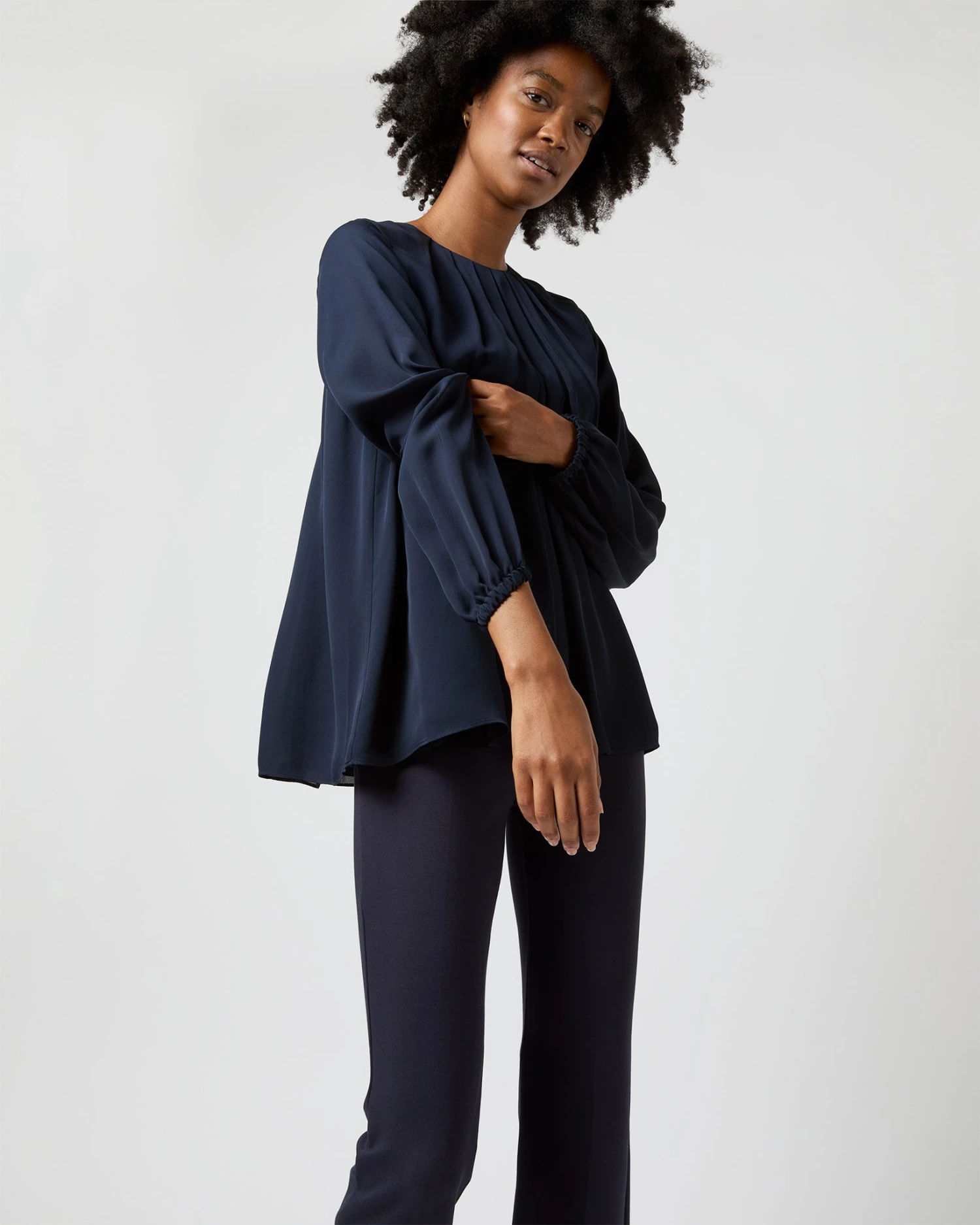 The Alex Top is a softer, more feminine take on a classic silk blouse, with romantic pleats at the neckline and subtle blouson sleeves with elasticated cuffs. It’s made of a delicate double georgette that’s lighter-weight than most of our other blouses… a perfect evening piece for all climates.