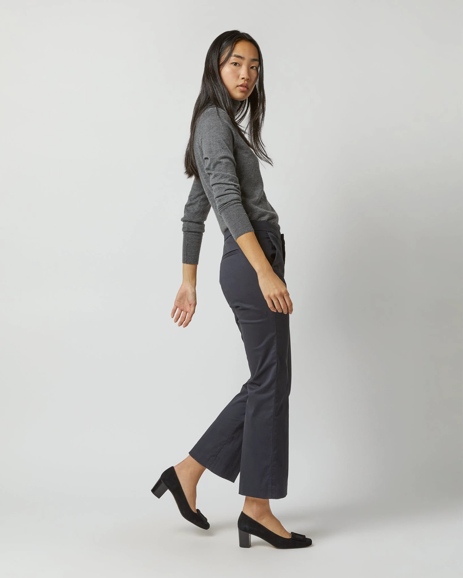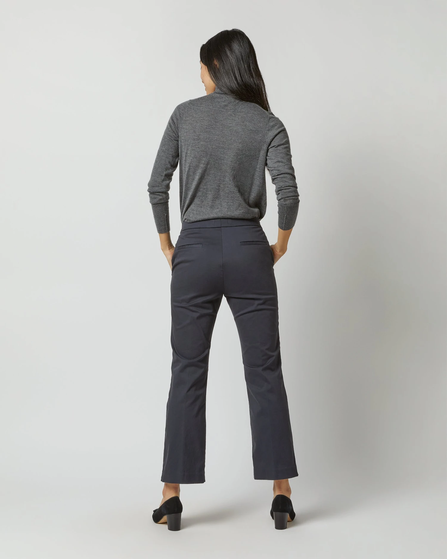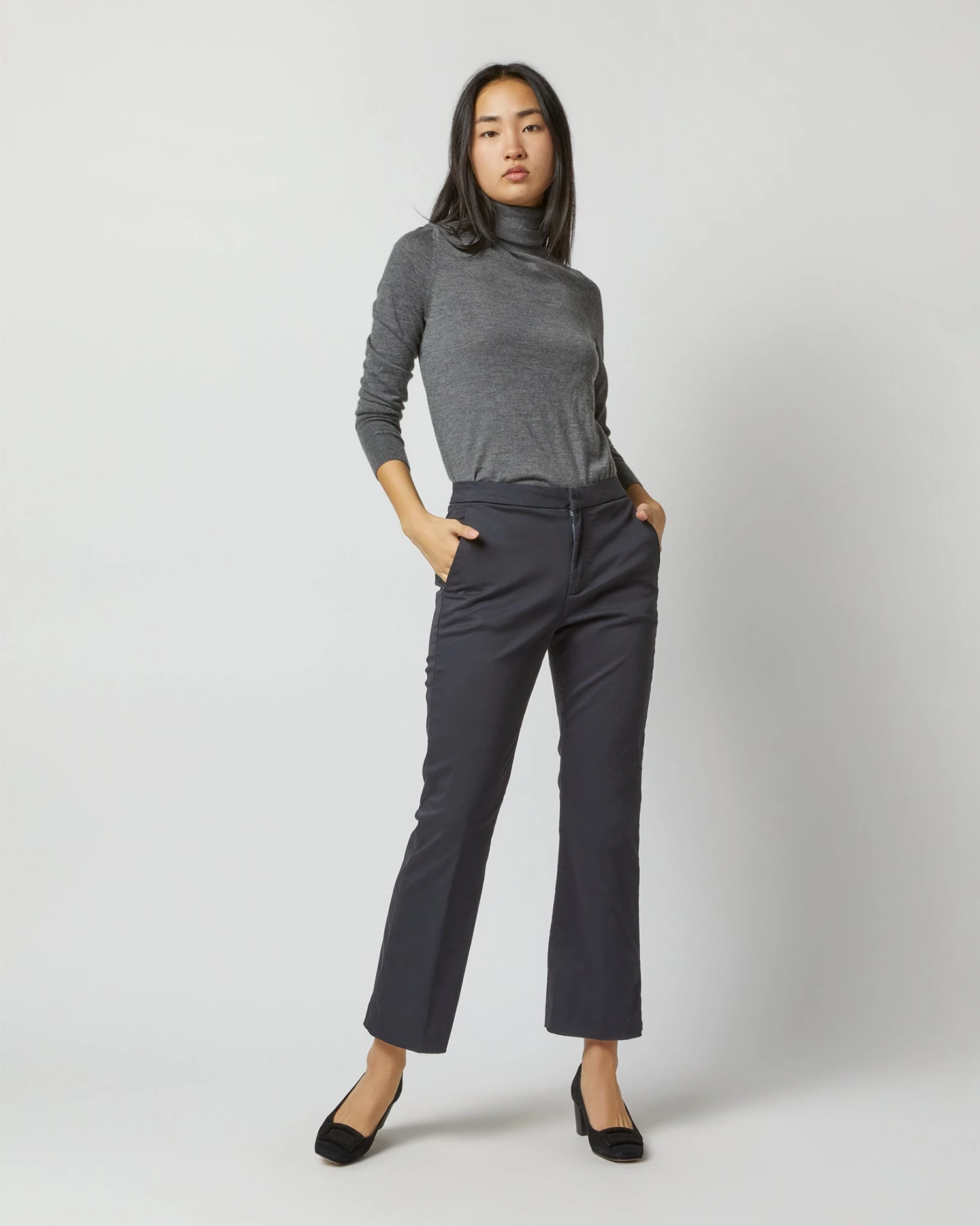 A new, menswear-inspired take on our all-time favorite crop-flare silhouette. The Bella Flare is made in Italy with a tab waist closure, angled side pockets, and like the name suggests, a cropped leg with a perfectly subtle kick flare. A really great pair of everyday trousers.
