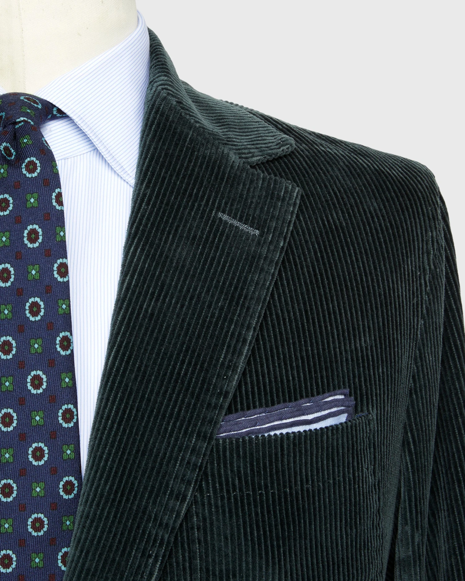 Somewhere between a chore coat and a blazer, the Butcher might be the easiest jacket we make. This one’s made from a super-rich Italian cotton corduroy and garment-dyed to a deep, unusual shade of pine green. It’s unlined and unconstructed, with a natural shoulder and pickstitched spalla camicia shirtsleeve construction. The pockets on the front are special, too: we designed them so that you can tuck in the flaps (without looking like you just tucked in the flaps) for a more open look. There are even reinforced elbow patches to really drive the “casual” thing home. The fit of the Butcher is easy, with a touch more room in the body than our tailored jackets. And while it looks great styled casually, we made a pair of matching trousers so you can also wear it as a full suit.