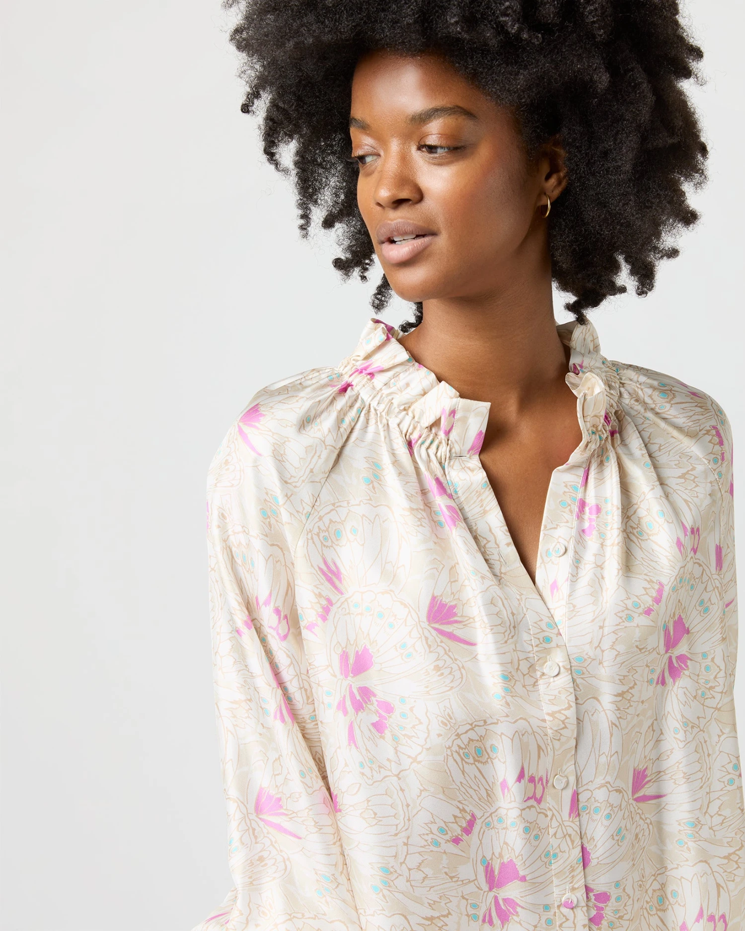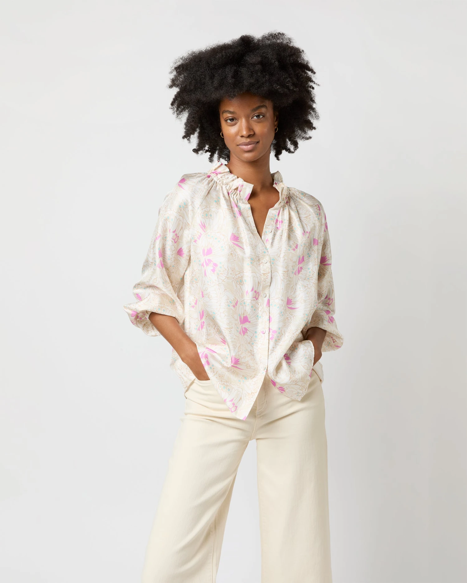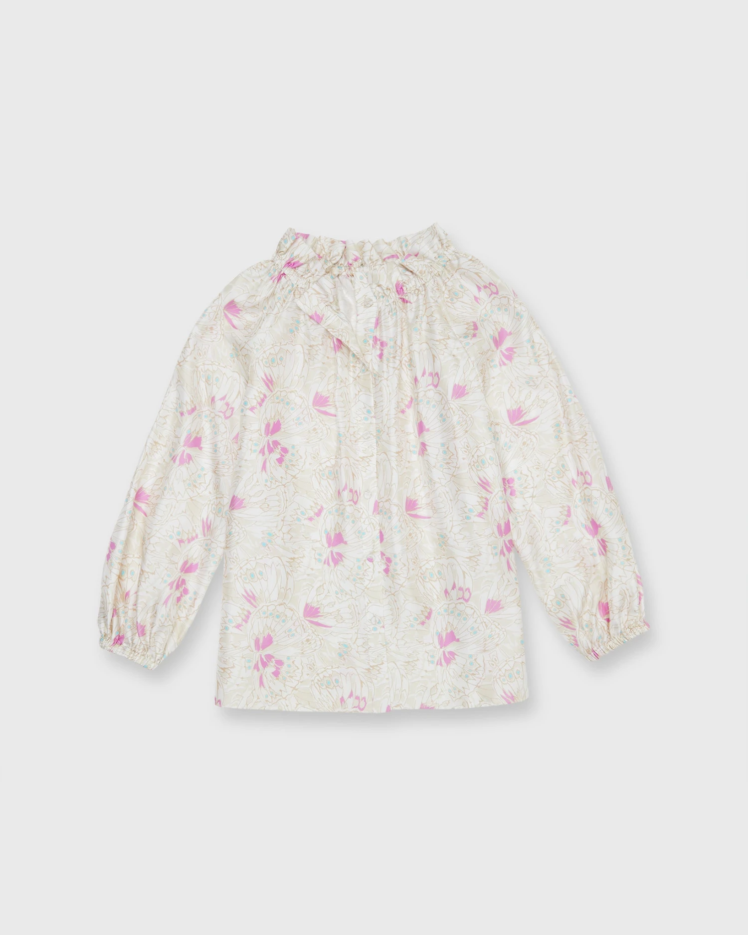 Very much a twist on a “button-up blouse,” this is a slightly less-sweet version of our hit Kamille shape. It’s got covered buttons down the front, plus the same elasticated neckline and wrists as the original for an easy, adjustable fit. This one’s made of silk twill from Italy with the prettiest, subtlest butterfly print.