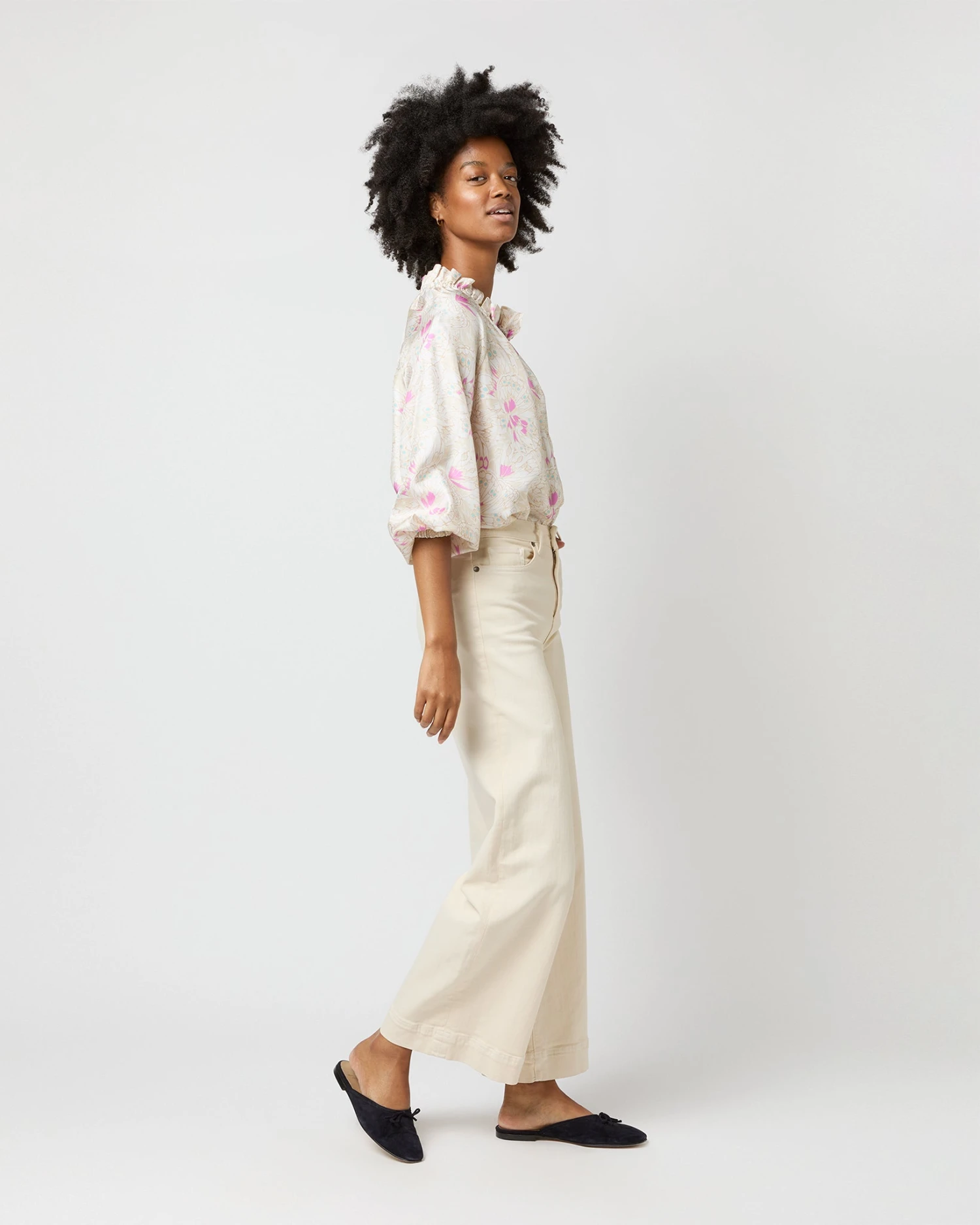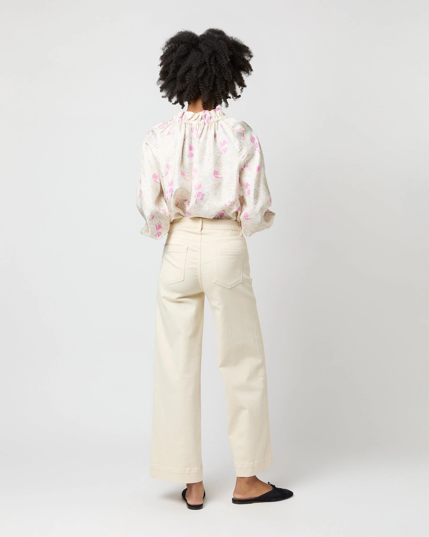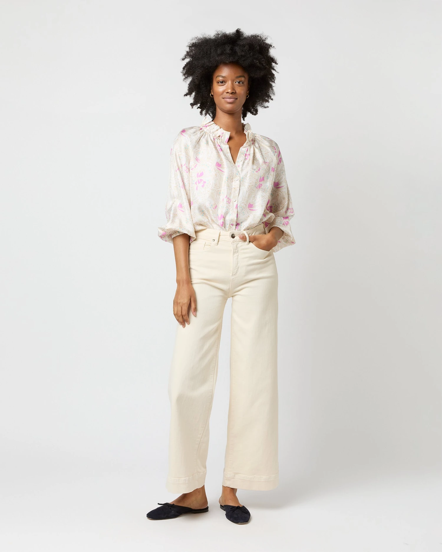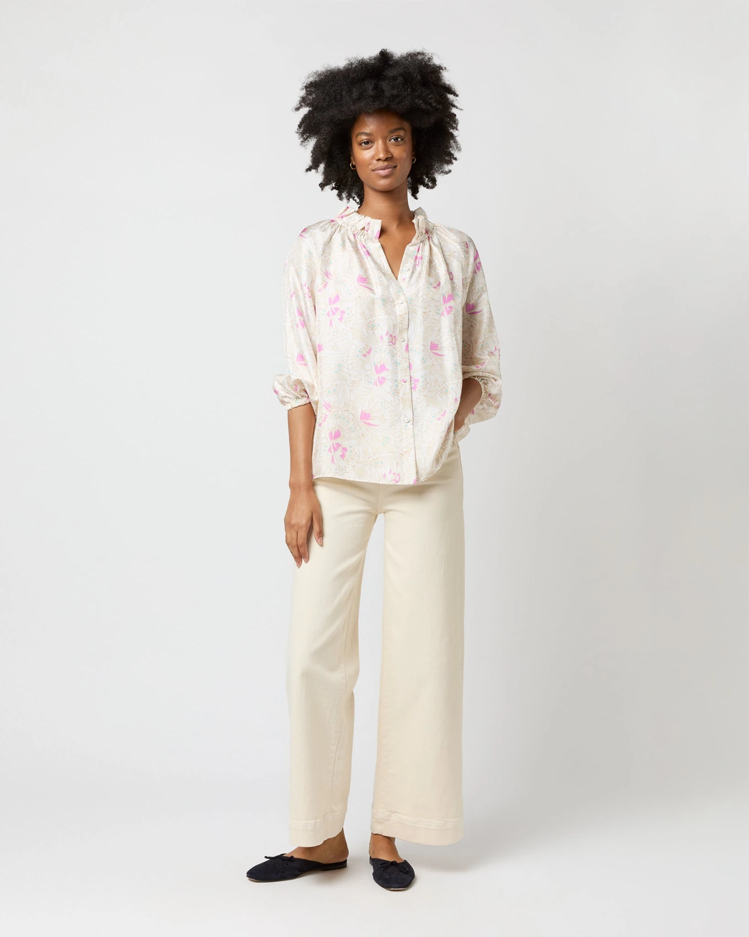 Very much a twist on a “button-up blouse,” this is a slightly less-sweet version of our hit Kamille shape. It’s got covered buttons down the front, plus the same elasticated neckline and wrists as the original for an easy, adjustable fit. This one’s made of silk twill from Italy with the prettiest, subtlest butterfly print.