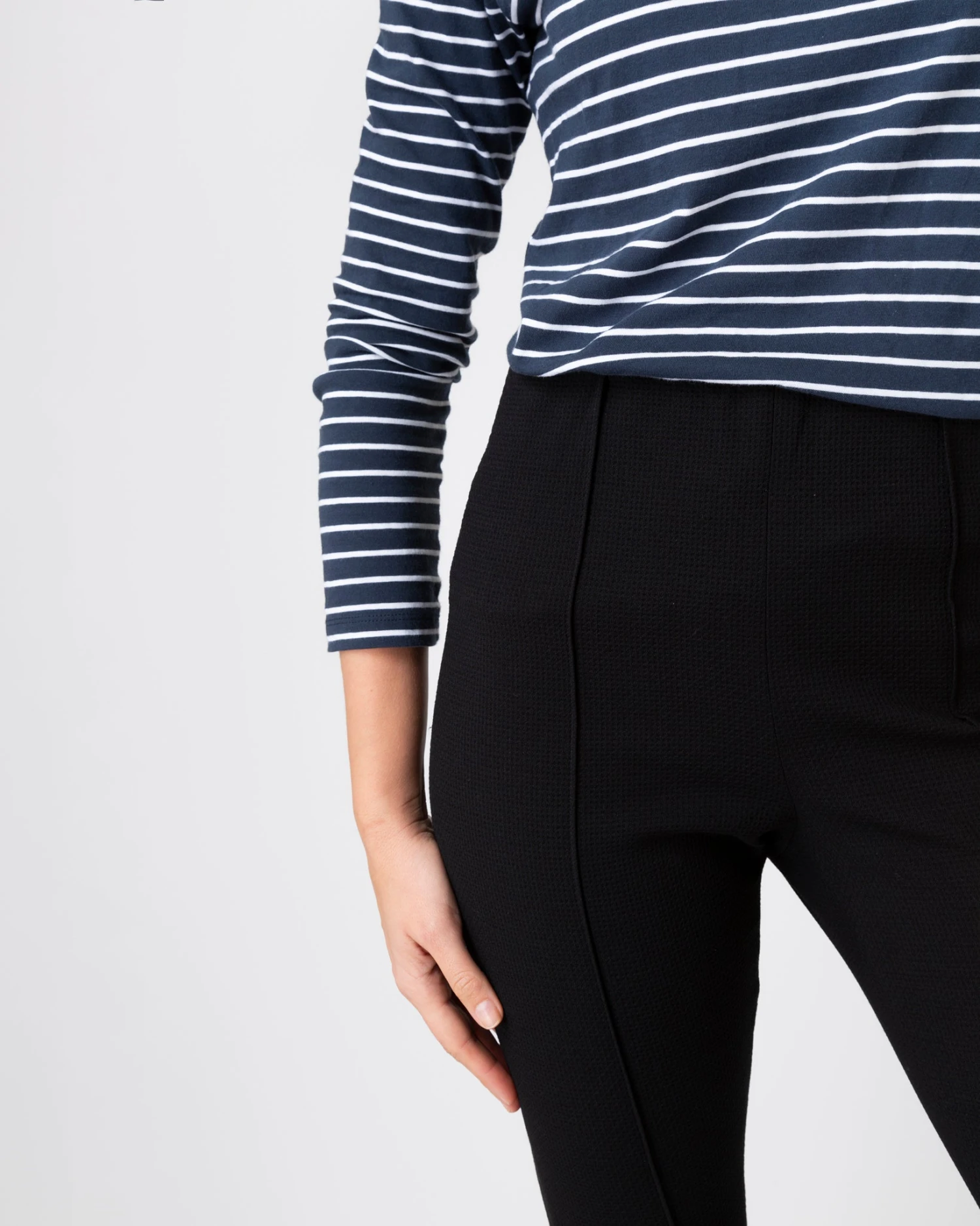 Minimal, clean, and quietly chic: our Faye shape is a refined pant without all the fuss. It just pulls on, with an elastic waist that doesn’t scream âelastic waistâ and a kick flare that’s cropped to an above-the-ankle length. This pair is made from an especially chic, lightweight waffle crepe from Italy that dresses up beautifully. And don’t let the fabric content throw you off. It’s super breathable, almost like a tropical wool, so it’ll work all year round.