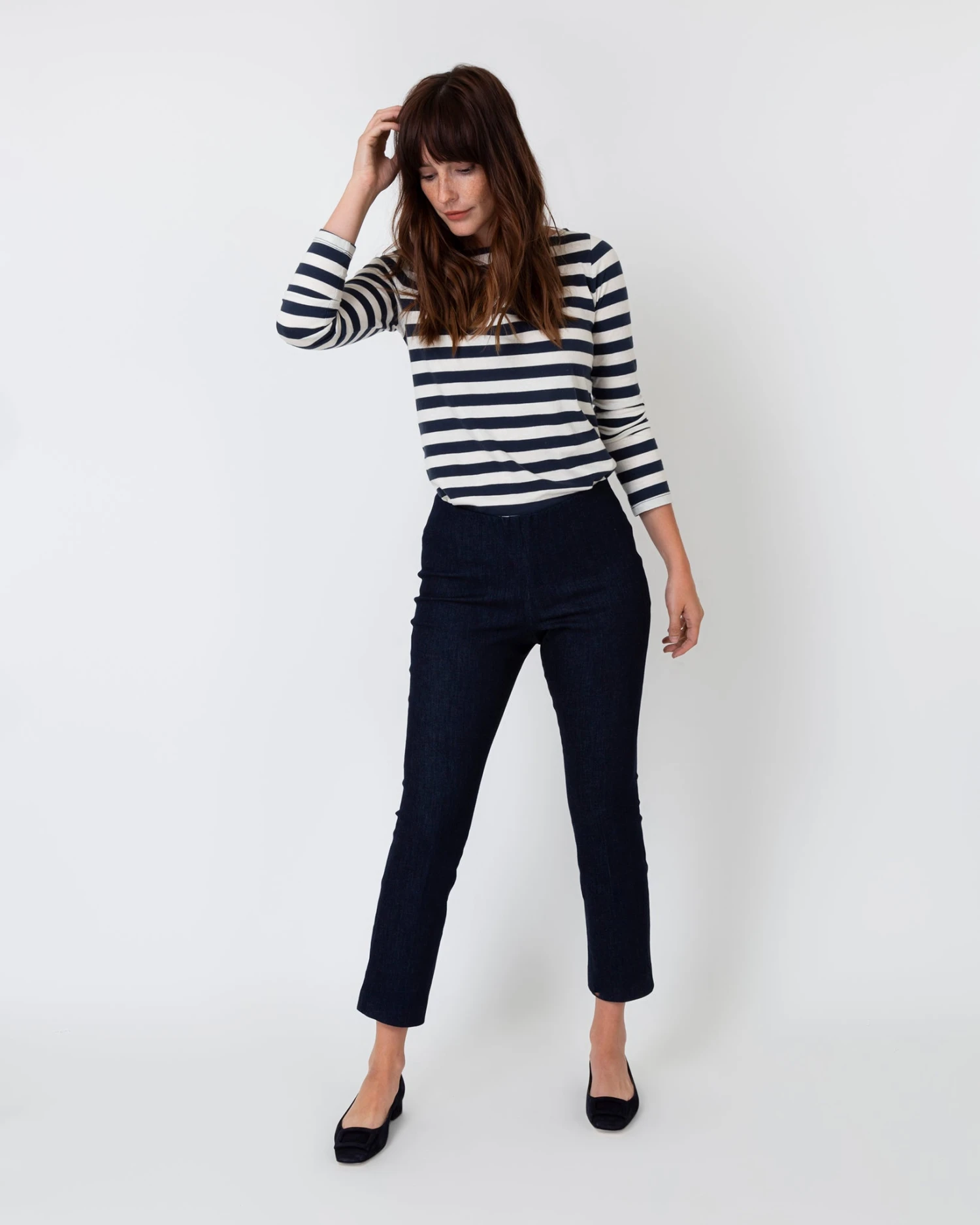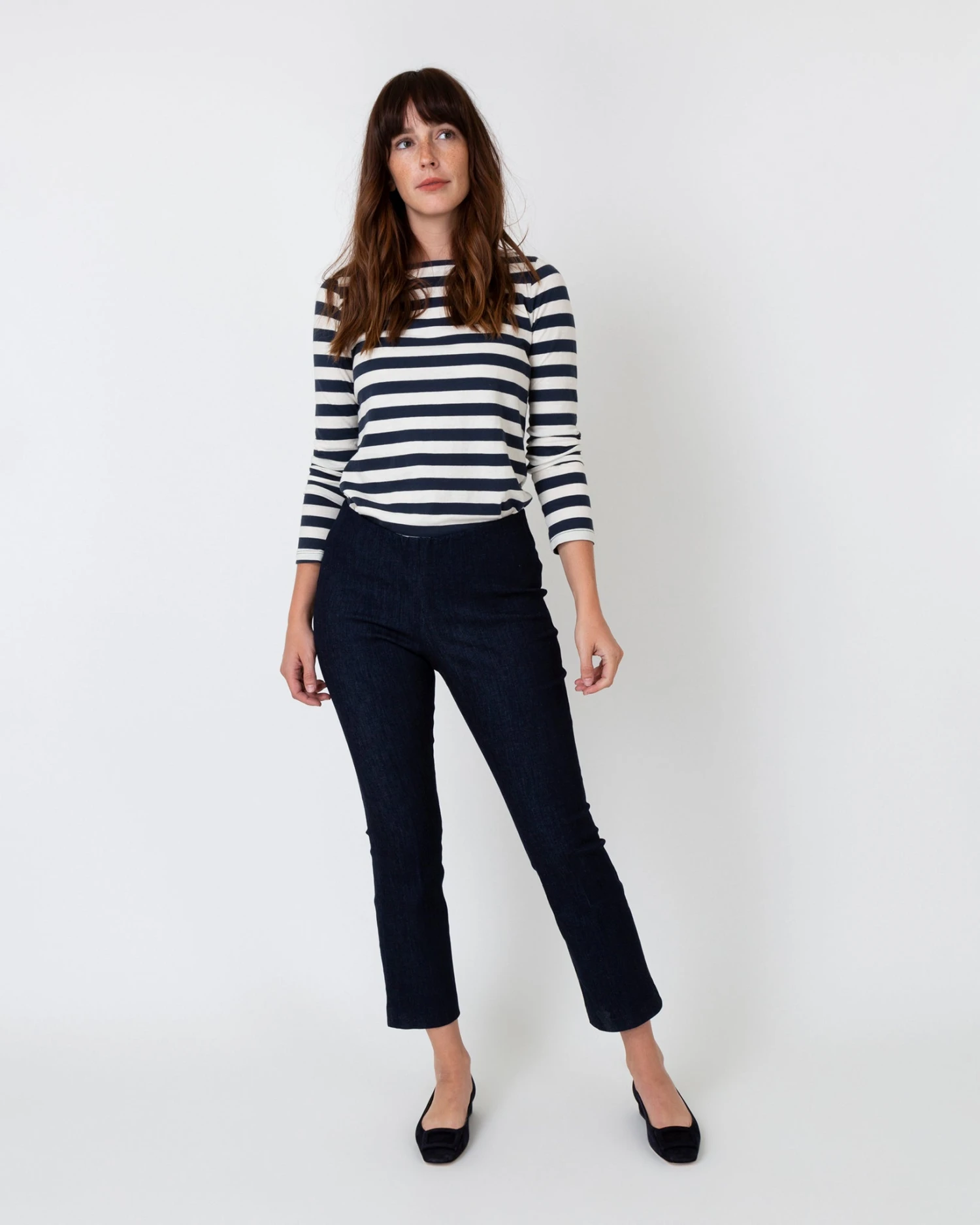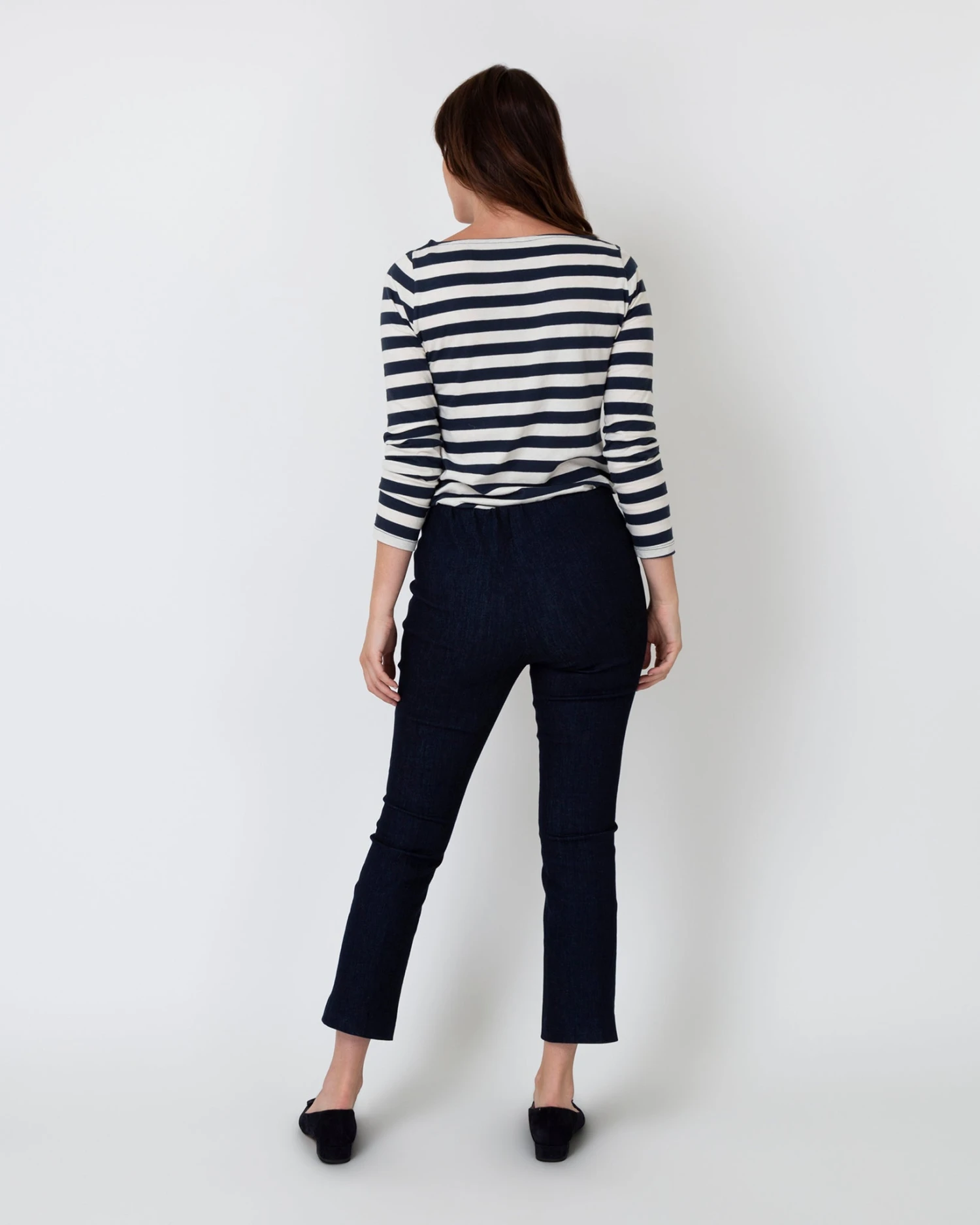 Minimal, clean, and quietly chic: our Faye shape is a refined pant without all the fuss. It just pulls on, with an elastic waist that doesn’t scream “elastic waist” and a kick flare that’s cropped to an above-the-ankle length. This pair is made from gutsy, stretchy (but not too stretchy) denim that moves along with you and holds its shape.