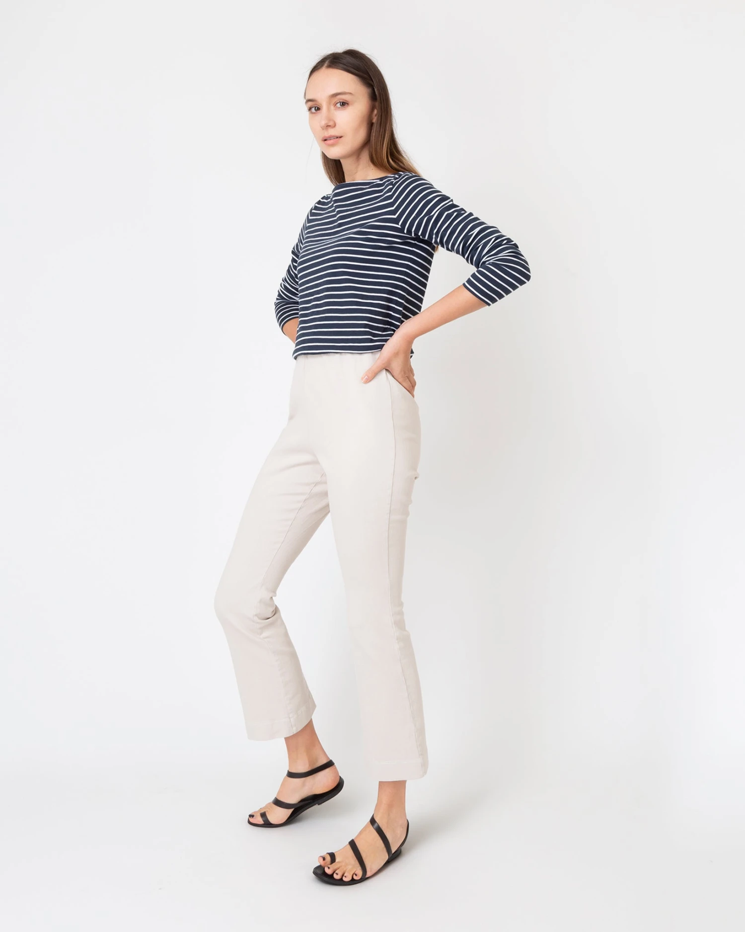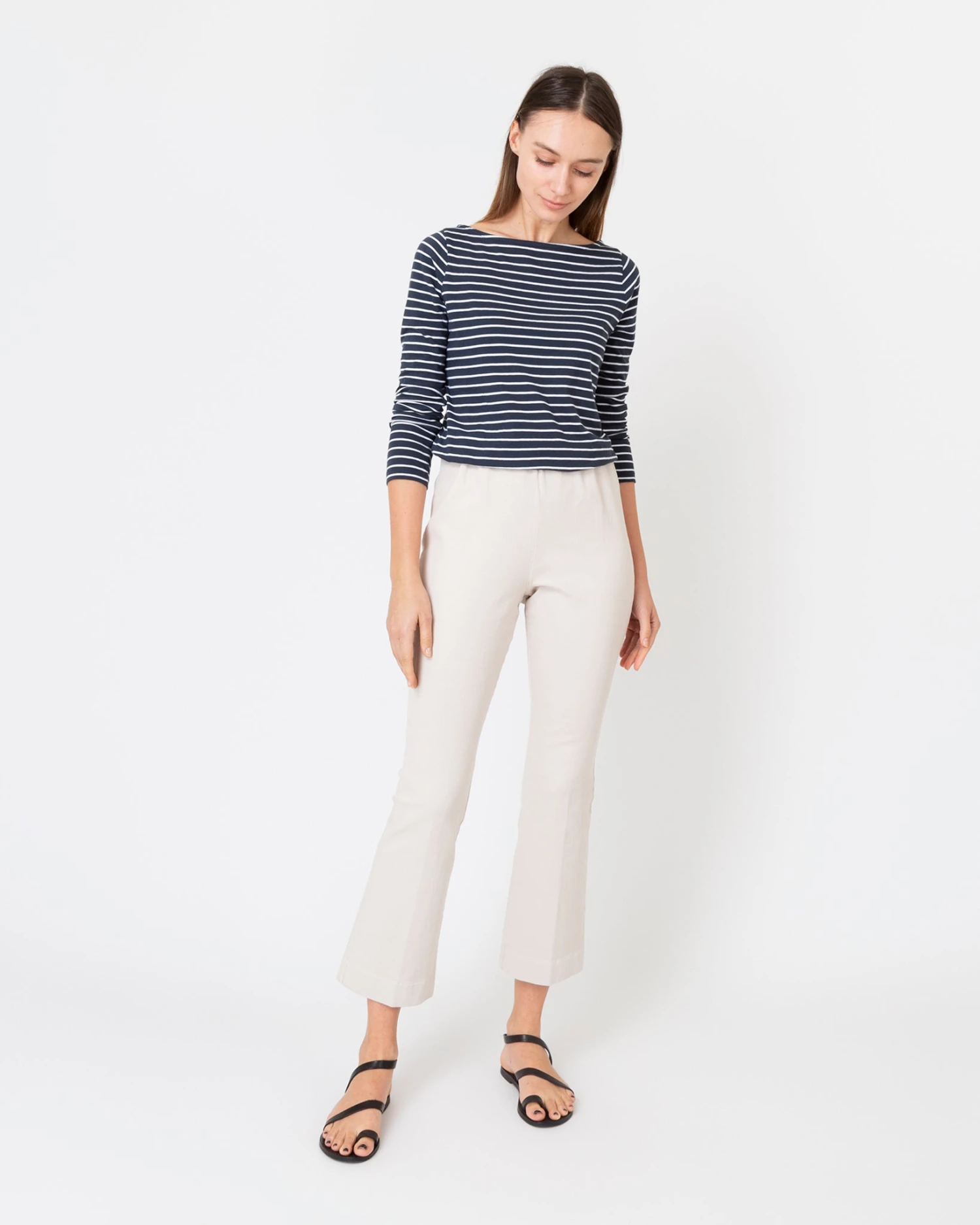 In garment-dyed twill, this is a sporty riff on everyone’s favorite pull-on pants… like jeans meet Faye. In fact, they’re made in Los Angeles at the exact same factory that produces our jeans. Think of them as denim without all the hardware. They just pull on, with an elastic waist that doesn’t scream âelastic waist,â and a kick flare that’s cropped to an above-the-ankle length.