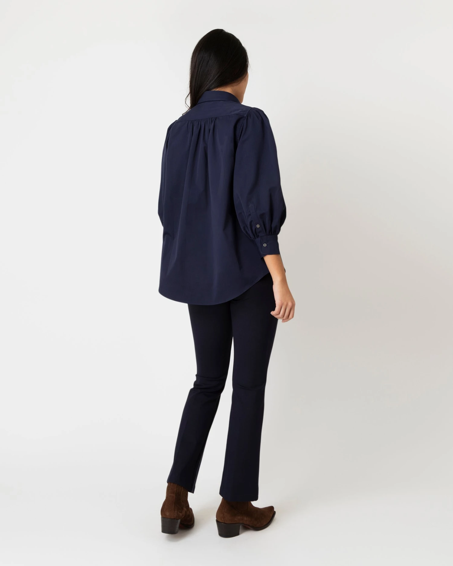 Geraldine is our latest favorite in the “romantic, puff-sleeved shirts” category. This one’s different, we promise! And already a hit. The sleeve hits higher on the shoulder than the Anaya or the Paulina and has more gathers at the top, which means it’s a more flattering way to do the volume trend for those with a broader build. It’s also got a covered popover placket and a rounded, high-low hem. This one’s made of crisp, silky 2ply Italian poplin and almost certain to be one of the more feminine shirts in your closet.