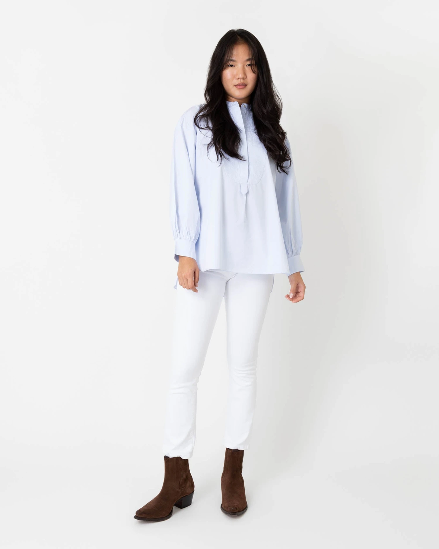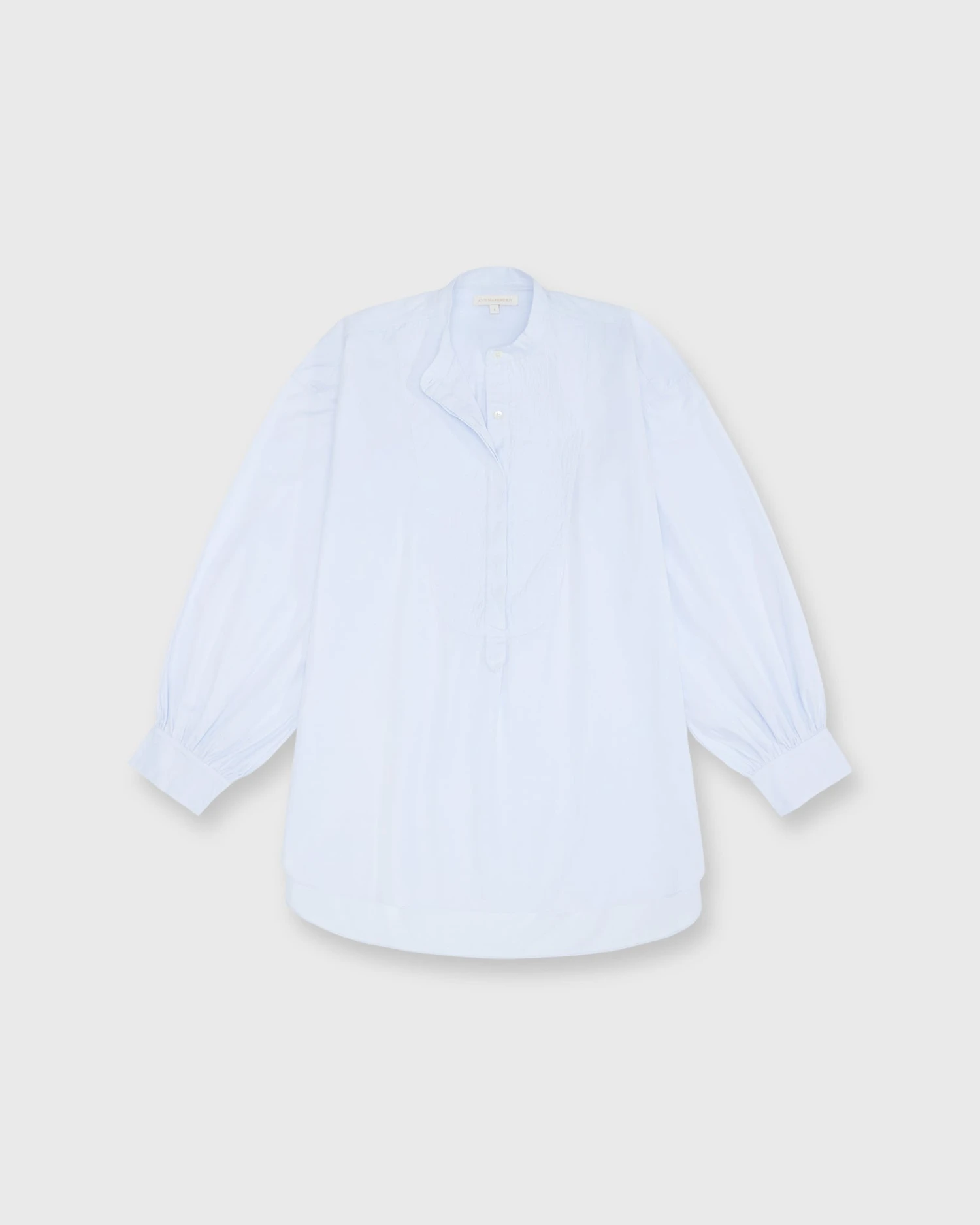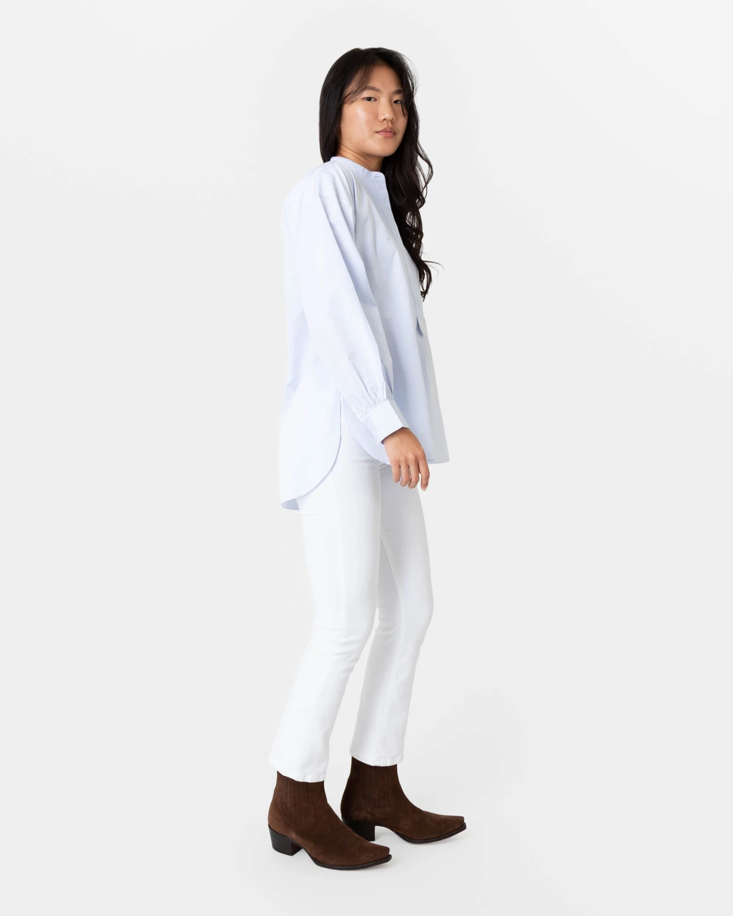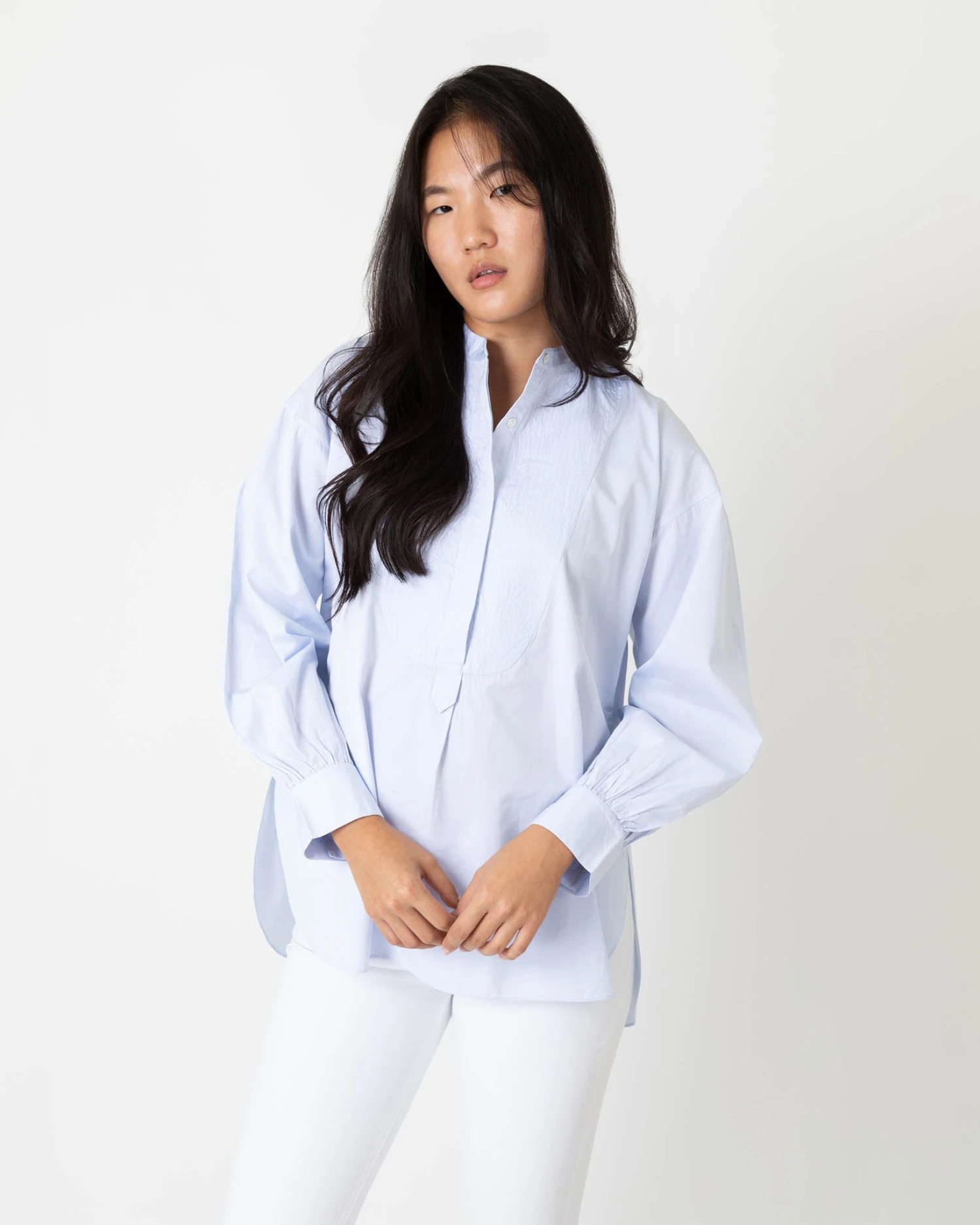 The Indira is an especially refined tunic shape that has a bib front and a flattering high-low hem. The fit around the shoulder and the sleeve is based on the Anaya — so there’s a moderate amount of volume, but not too much — and it’s made of a crisp Portuguese poplin in the prettiest, palest shade of sky blue.