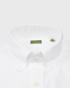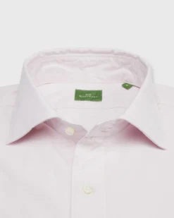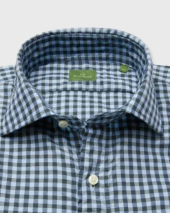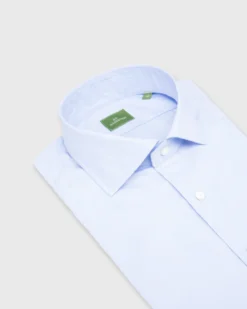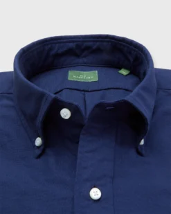A solid navy shirt is very cool — it gives a softened-up-Johnny-Cash vibe — and easier to wear than you’d think. Jeans, cords, khaki pants, sky’s the limit. This one is made from fine, 2ply/2ply Italian poplin and has a modified spread collar with lightweight, nonfused interlining for a soft, relaxed look. As always, the cut is slim but never skinny, with a high armhole for mobility and a long-enough-to-stay-tucked-in shirttail. (Sid likes it this way, but you can always get it shortened.) It’s made with single-needle stitching, 22 stitches/inch, flat-felled seams, and thick, 3.5mm Trocas shell buttons.