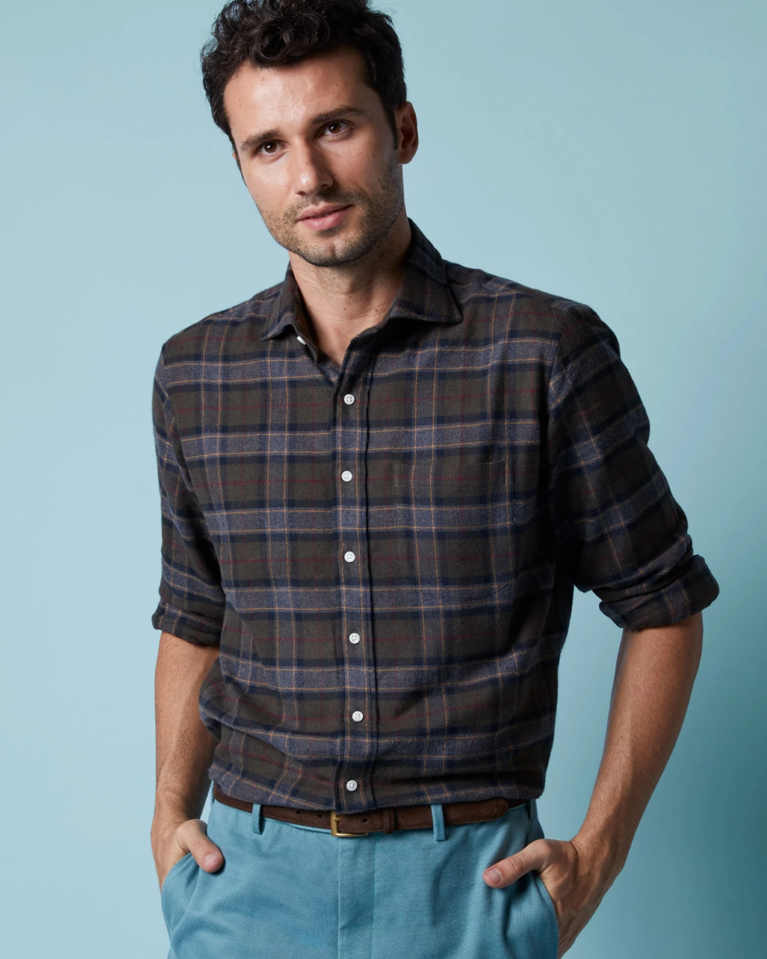 Spread Collar Sport Shirt In Olive/Berry/Scotch Plaid Flannel