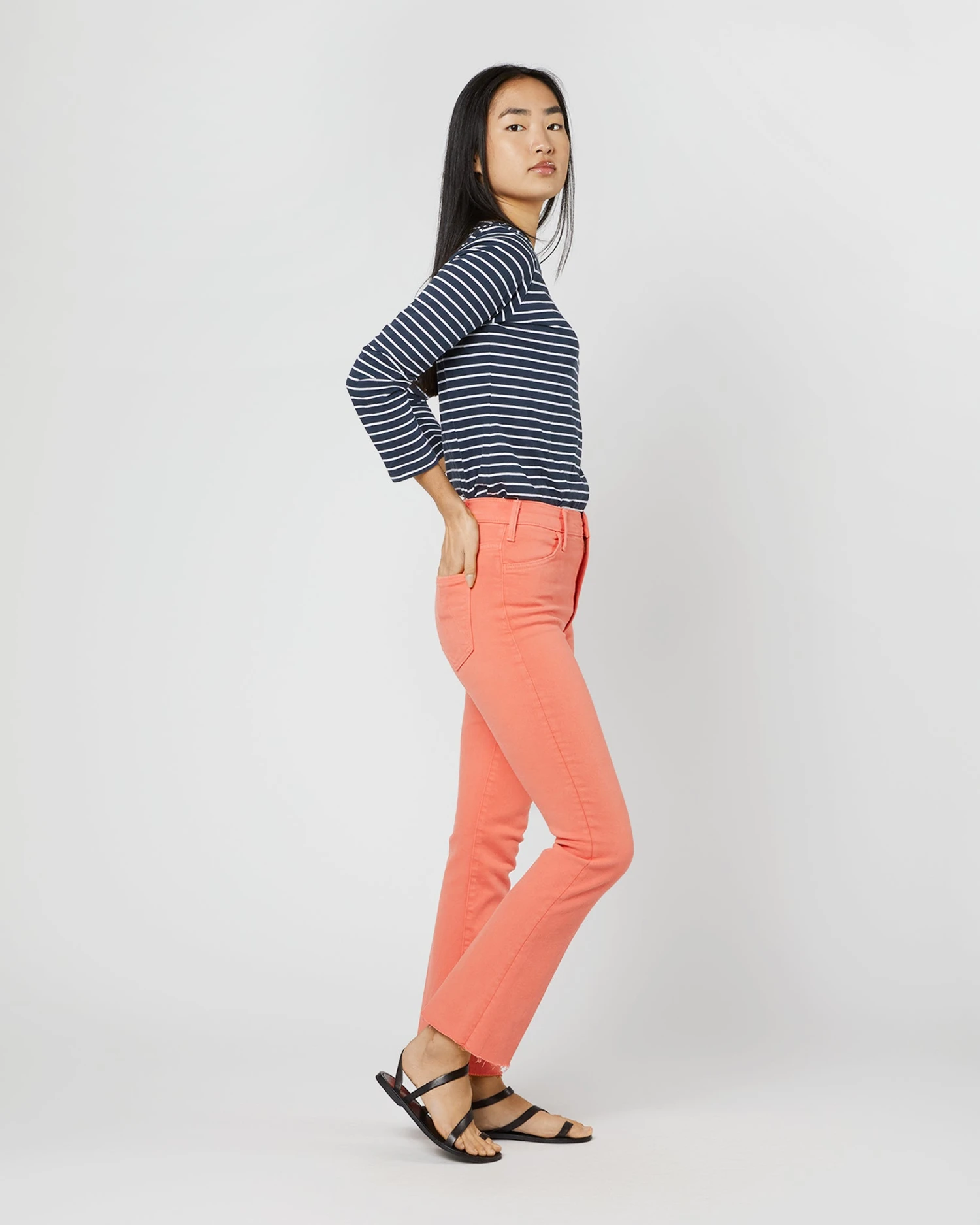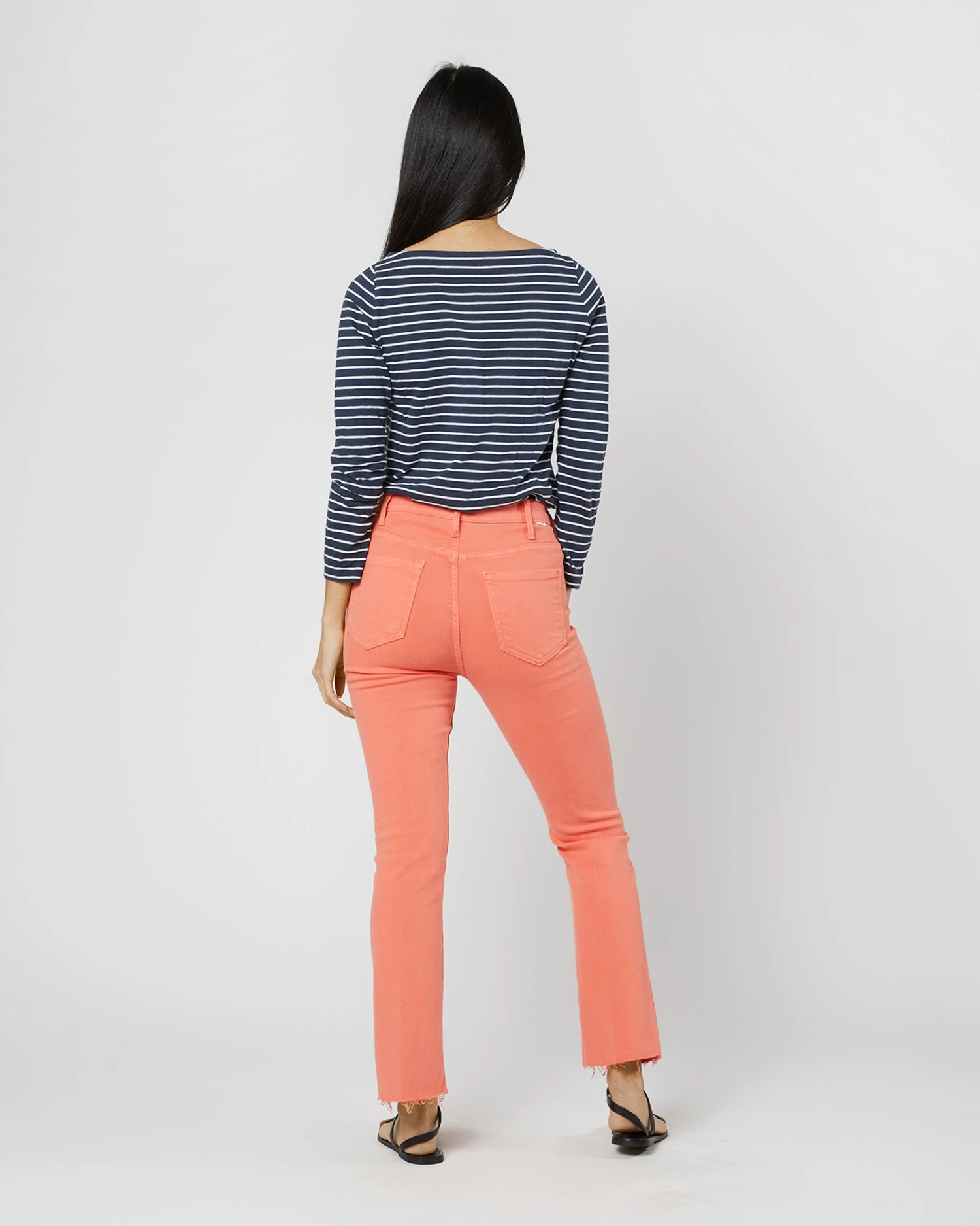 LA-based MOTHER makes the softest, stretchiest jeans around — and they all have clever, memorable names to boot. Like the Hustler: a cropped bootcut shape with a super-high waist and frayed hems. This pair is made up in a punchy shade of persimmon with tonal hardware and, as promised, plenty of stretch.