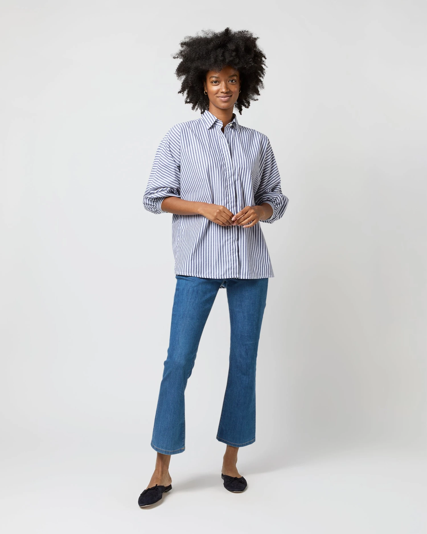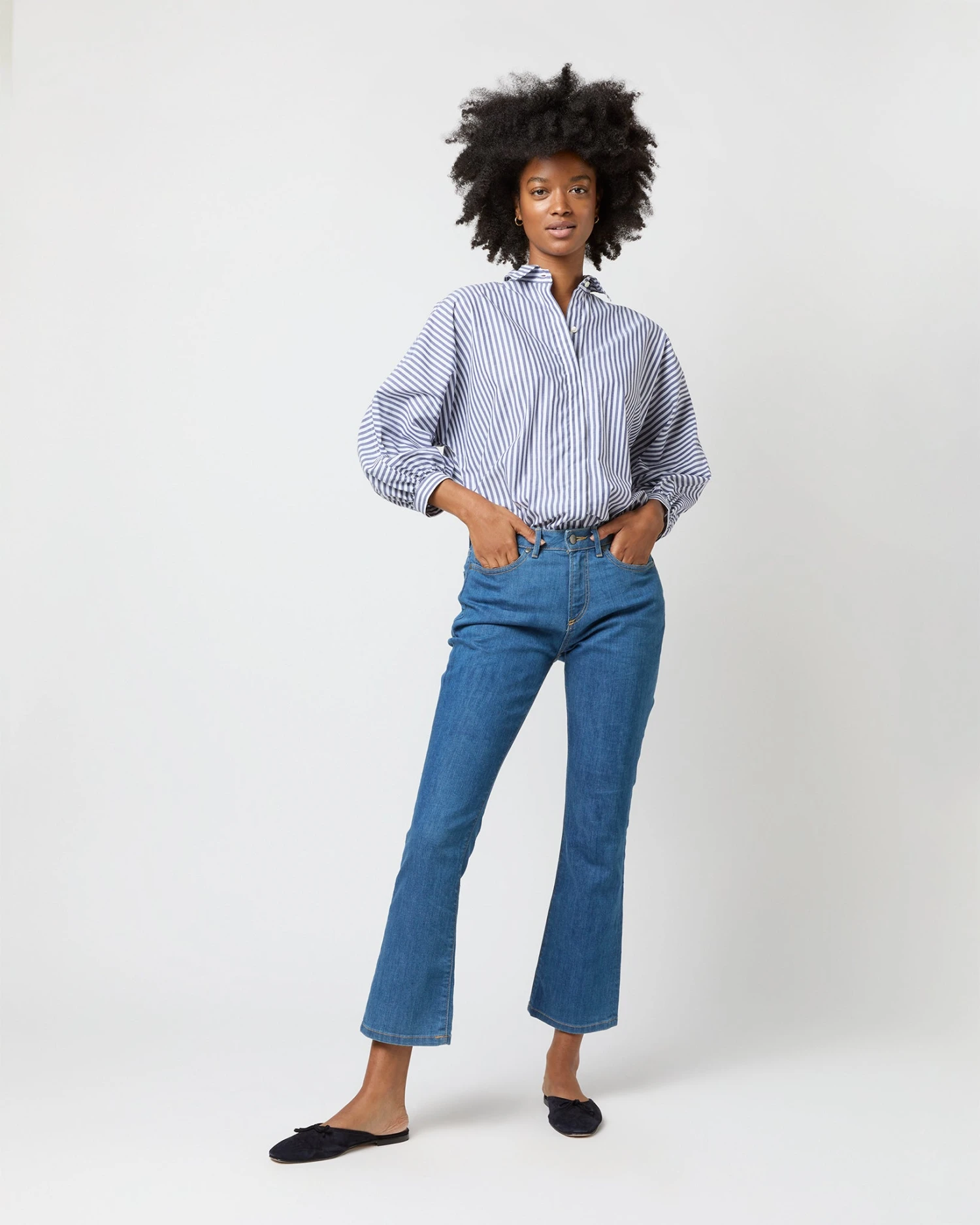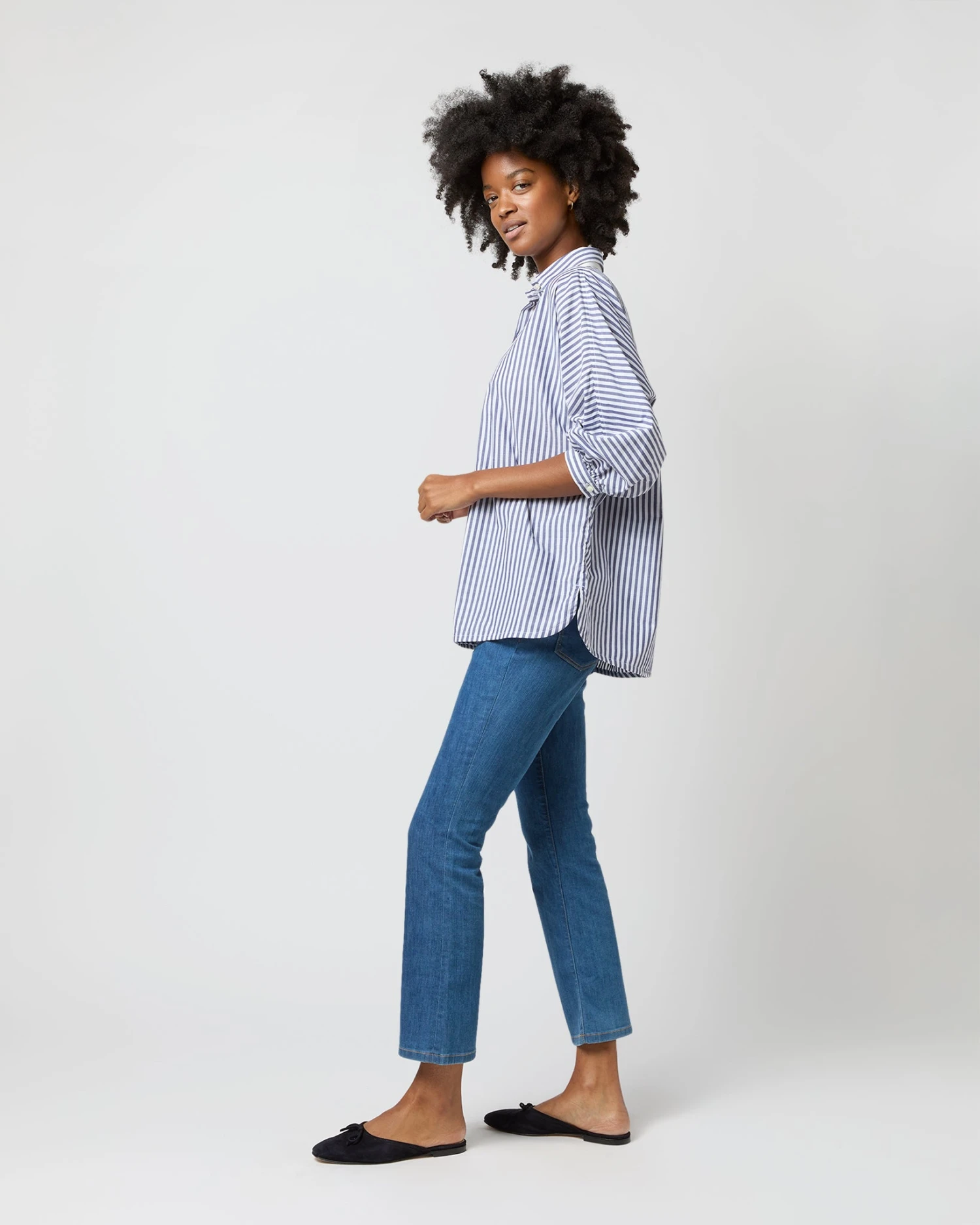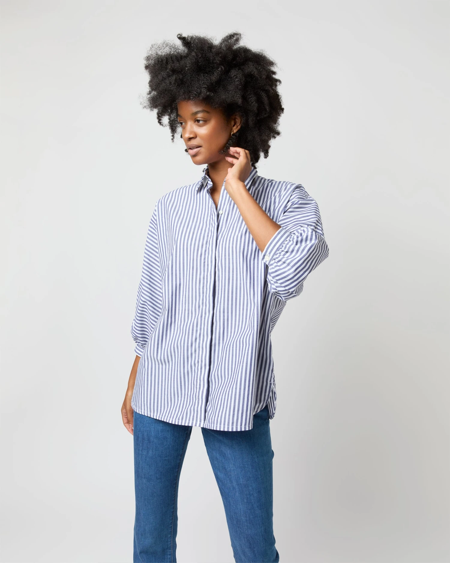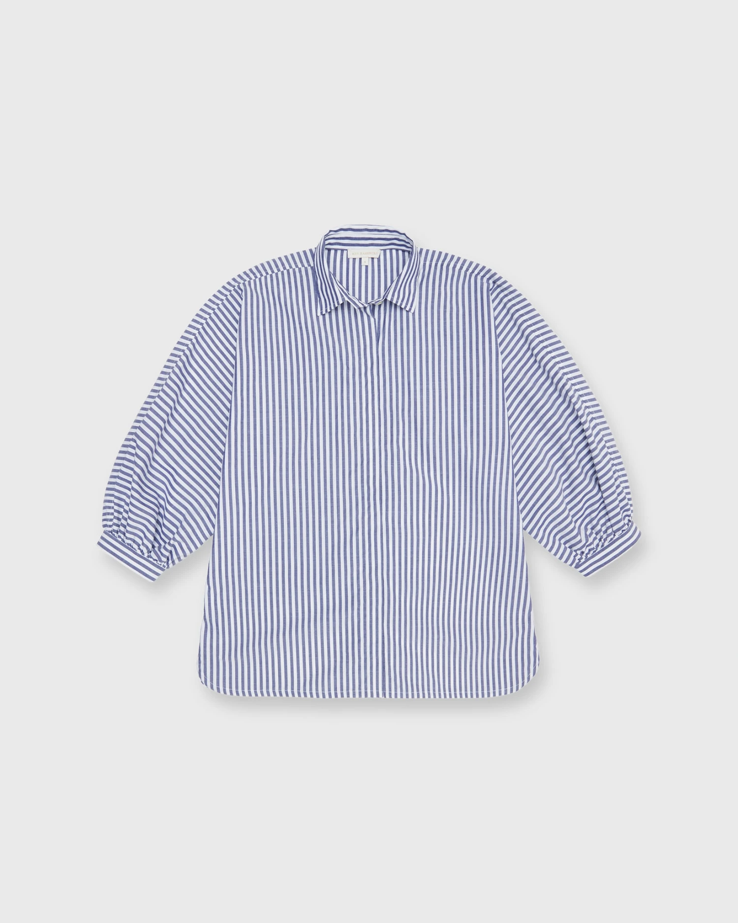 You never really have enough striped shirts, do you? Or maybe you do — but not quite like this one! It’s got a point collar, a covered front placket, puffed bracelet-length sleeves, slits at the side, and the shape is easy through the body, but still polished. This one’s made up in a textured, lightweight Italian chambray in a color combination made just for us.