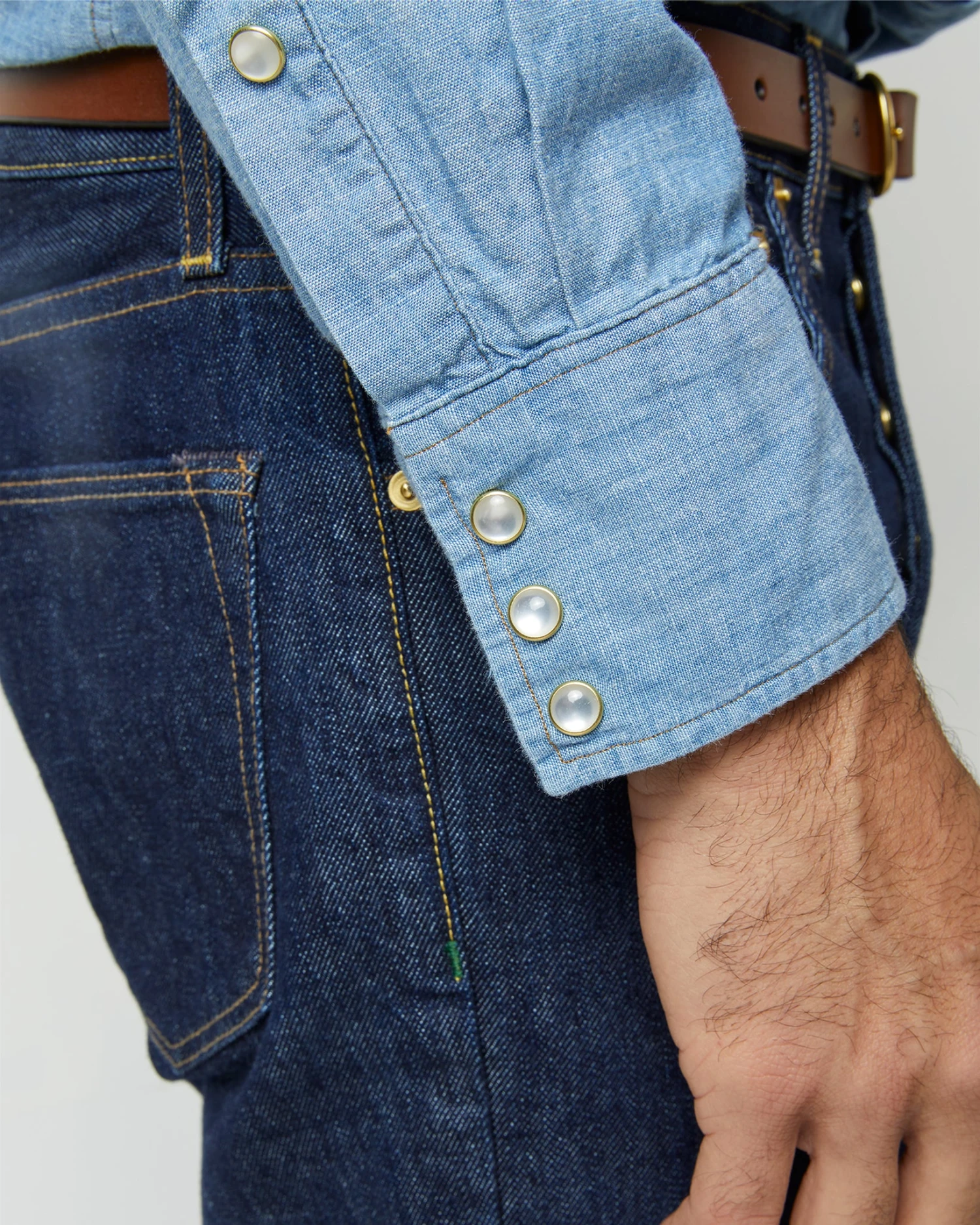 This is a true-blue Western shape down to the pearl snaps, pointed yoke, and triple-snap cuff, and we’ve updated it with a shorter length designed to wear untucked. There are two pointed snap pockets at the front, a modified spread collar, and an easy, slim-but-not-skinny shape. (Plus the same single-needle stitching, 22 stitches/inch, and flat-felled seams of all of our shirts.) It’s made of a super light, washed-down indigo chambray that’ll continue to fade the more you wear it.