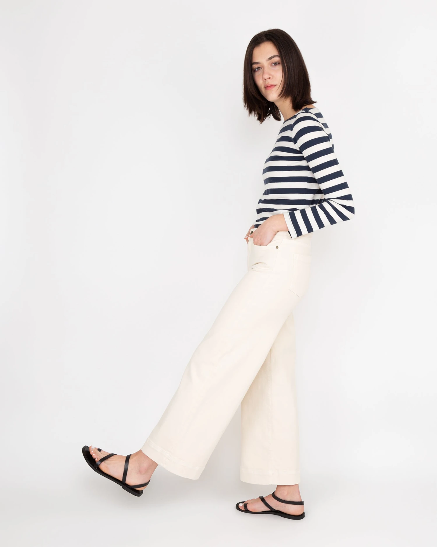 Our jeans program started with a straight-leg, then a cropped flare, then a skinny, so this wide-leg silhouette completes the set. No high-tech fabric composition, no fussy back pocket stitching, no magic seam placement… just a classic pair of jeans that makes you look like a better, more pulled-together version of yourself. Each pair is made in Los Angeles (just like our men’s jeans) out of wildly soft, stretch Cone Mills denim in an old-school-feeling shade of stone.